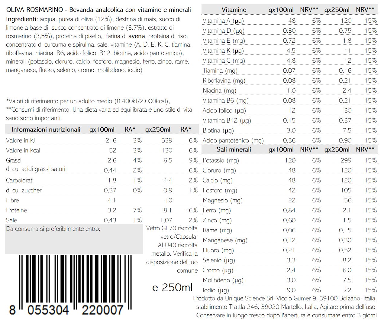 Ingredienti: acqua, purea di olive (10%), destrina di mais, succo di limone a base di succo concentrato di limone (3,7%), estratto di rosmarino (3,5%), proteina di pisello, farina di avena senza glutine, proteina di riso, concentrato di curcuma e spirulina, sale, vitamine (A, D, E, K, C, tiamina, riboflavina, niacina, B6, acido folico, B12, biotina, acido pantotenico), minerali (potassio, cloruro, calcio, fosforo, magnesio, ferro, zinco, rame, manganese, fluoro, selenio, cromo, molibdeno, iodio)